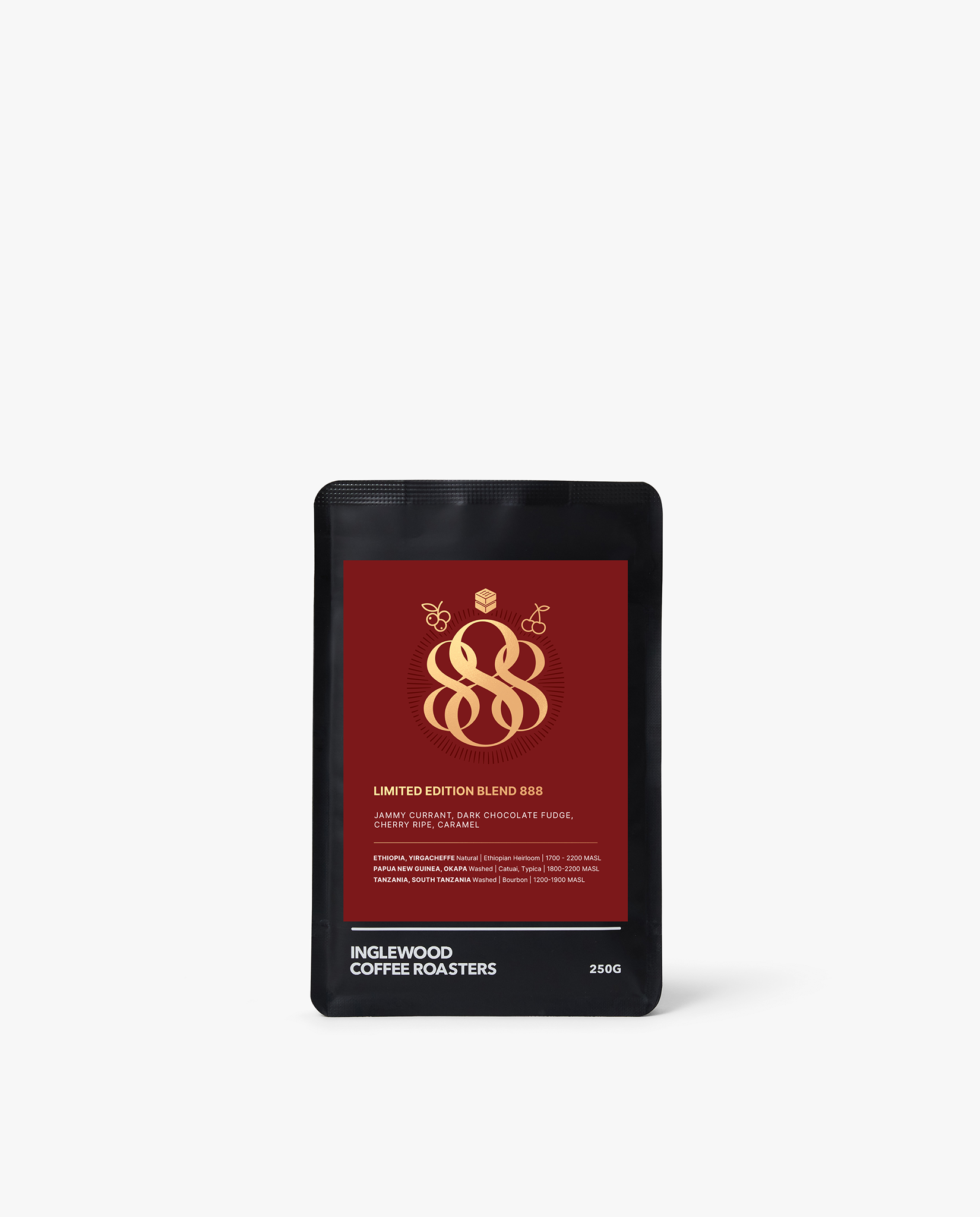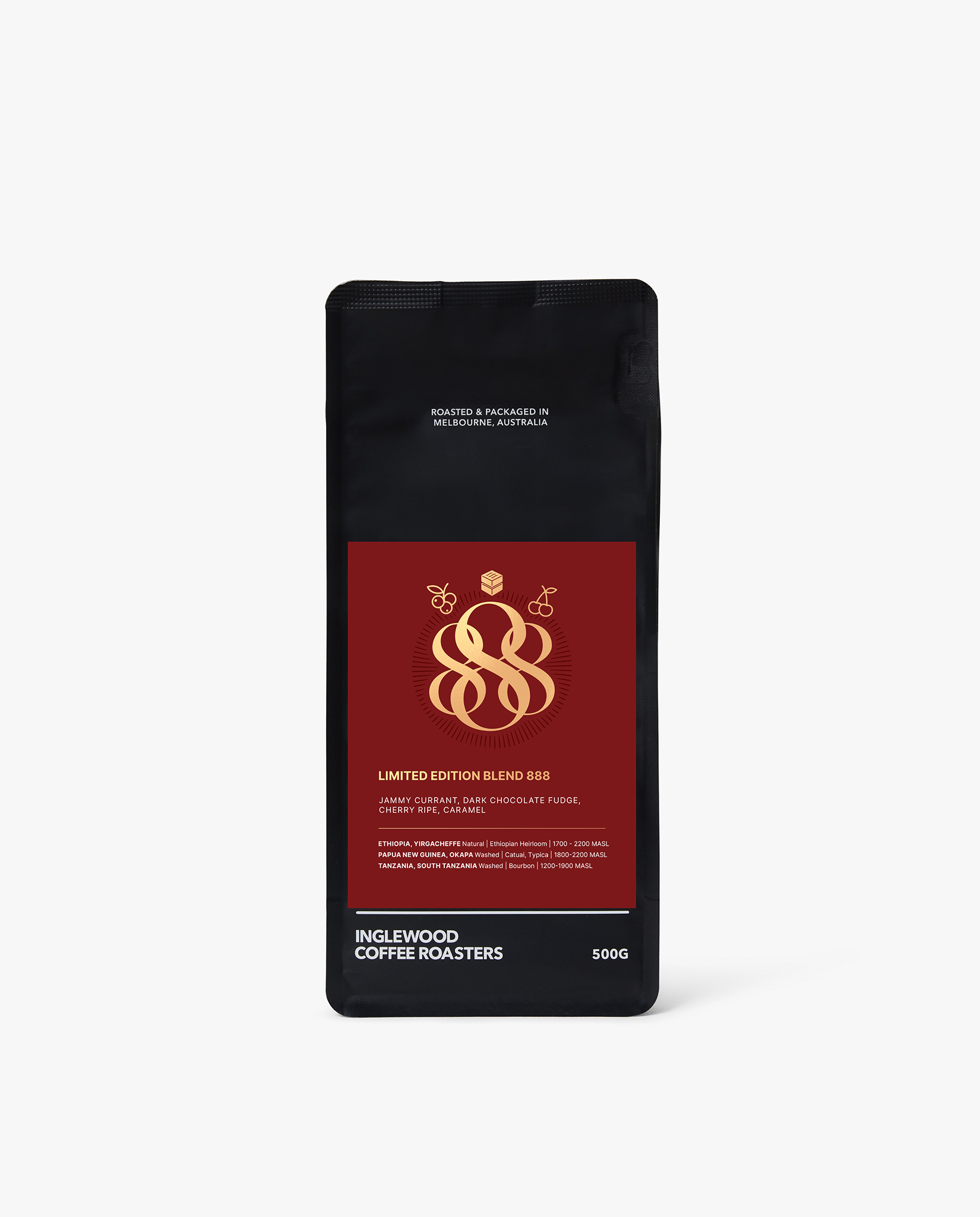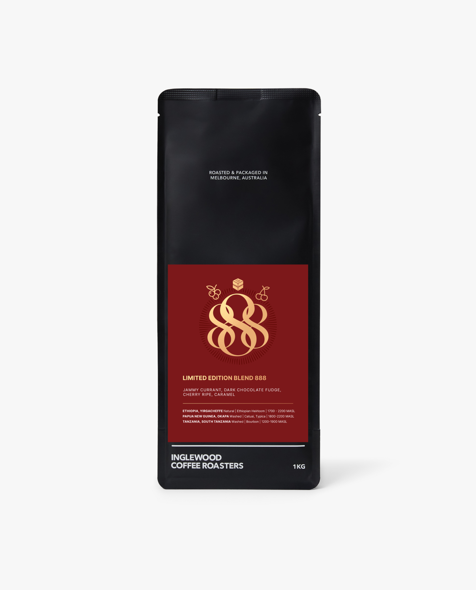 This 888 Blend encompasses a washed coffee grown in the lush highlands of the Okapa region in Papua New Guinea, along with a naturally processed coffee produced by bespoke farmers in Ethiopia, and a vibrant juicy coffee which has come through the traditional washed Kenyan method. Dessert tasting notes abound, offering chocolate fudge, creme brulee and cherry ripe notes for black coffee drinkers, while milky notes will tease out hints of black forest cake and chocolate crepe.